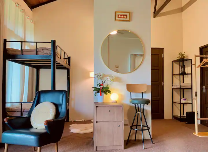 - Amenities: 农场, 厨房, 双人床床垫, 吹风机, 急救箱, 户外花园和凉亭, 森林保留日出山景, 沙发和起居区, 灭火器, 烧烤和火锅坑, 熨斗, 私人洗手间, 私人阳台, 空调, 餐具, 鱼塘景观